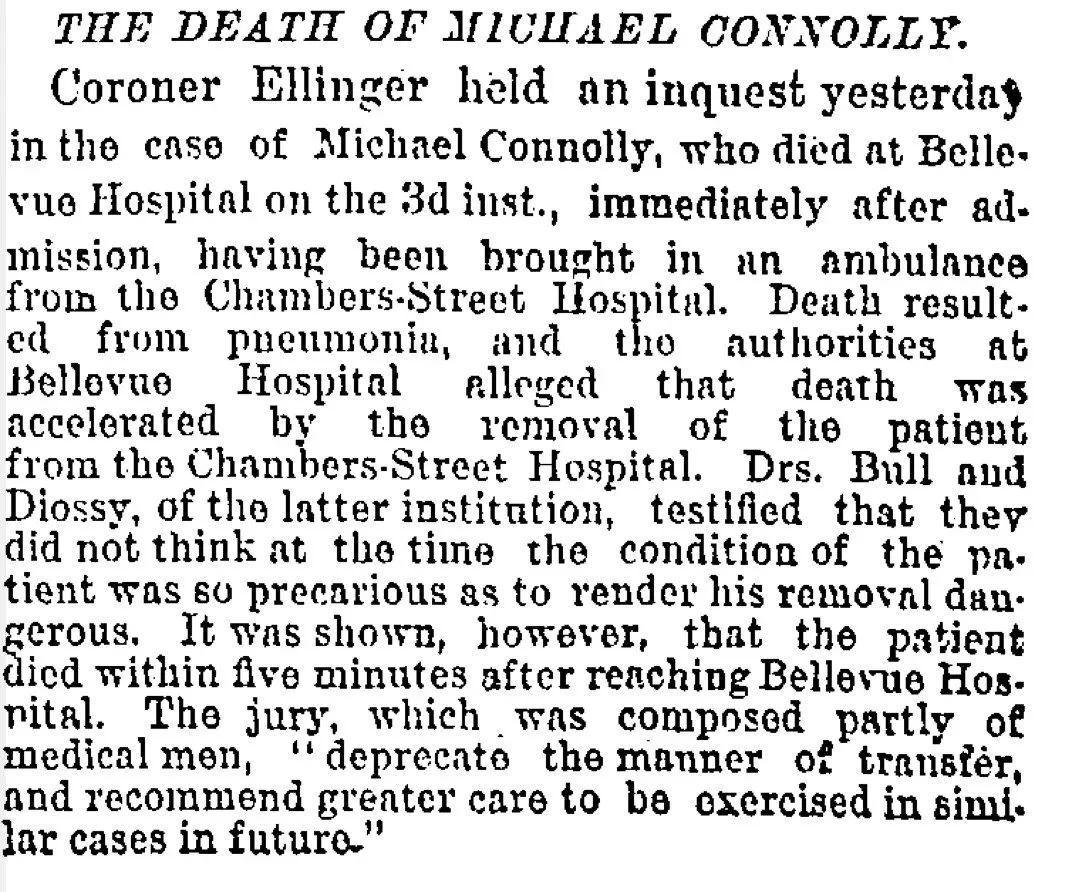 In an 1877 article, “The Death of Michael Connolly,” The New York Times documented one of the first known cases of patient dumping. While pneumonia was the official cause of Connolly’s death, authorities at Bellevue Hospital, where he was being treated, “alleged that death was accelerated by the removal of the patient from Chambers Street Hospital [where he was initially dropped off].”
